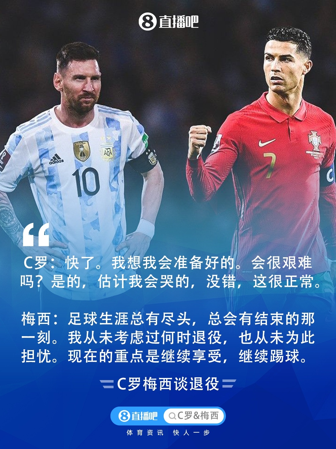 11月06日讯 近日,40岁C罗和38岁梅西先后接收采访,皆谈到了策动退役的话题。