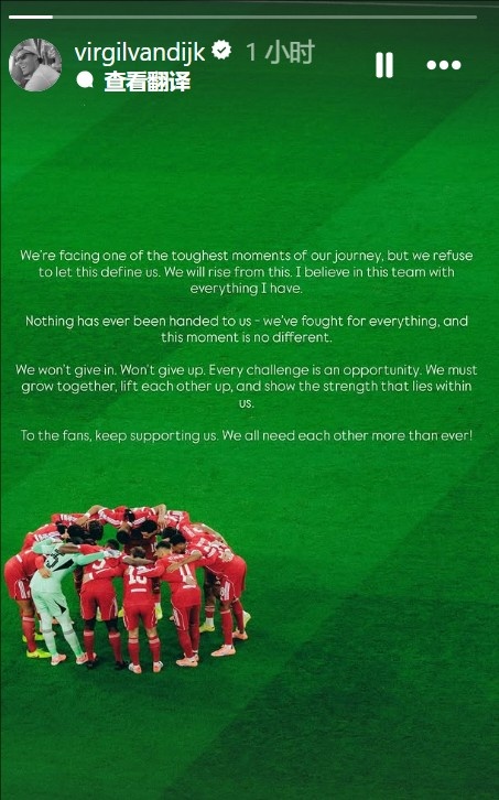 范戴克写谈:咱们正濒临旅程中最深奥的时刻之一,但咱们拆除让这一切界说咱们。咱们将从中崛起。我尽心全意慑服这支球队。