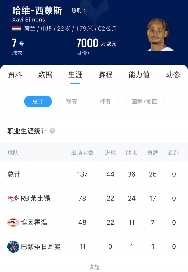 22岁的荷兰中场哈维-西蒙斯,在场上主要司职前腰,也不错踢傍边边锋两个位置。西蒙斯上赛季为莱比锡出战33场得益11球7助,现在他的德回身价为7000万欧元。