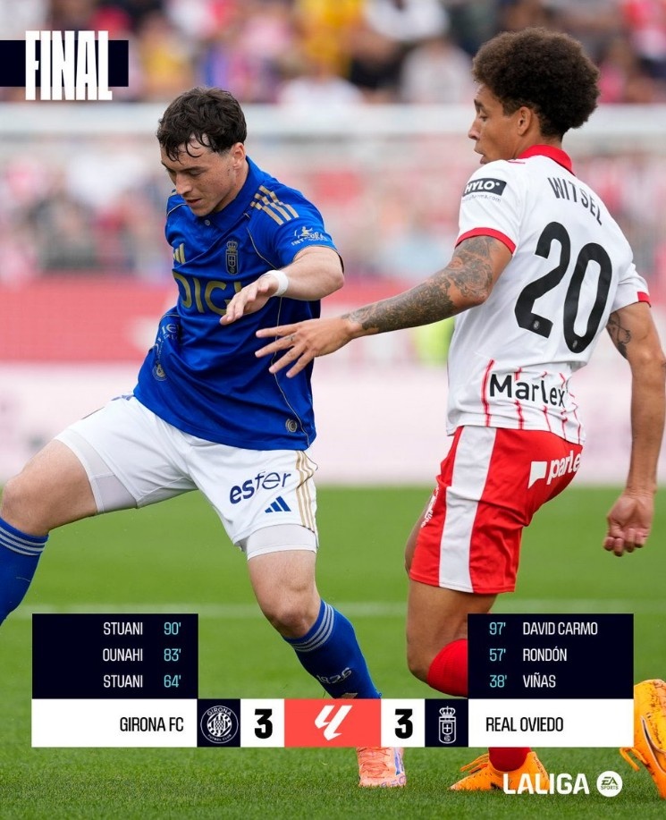 本场比赛皇家奥维耶多在38分钟愚弄点球先拔头筹,随后第58分钟龙东破门扩大跳跃优势;随后场优势波突变,赫罗纳在第64分钟、83分钟以及90分钟连进三球,其中斯图亚尼打进两粒点球,不外皇家奥维耶多在第97分钟由卡尔莫完成绝平。
