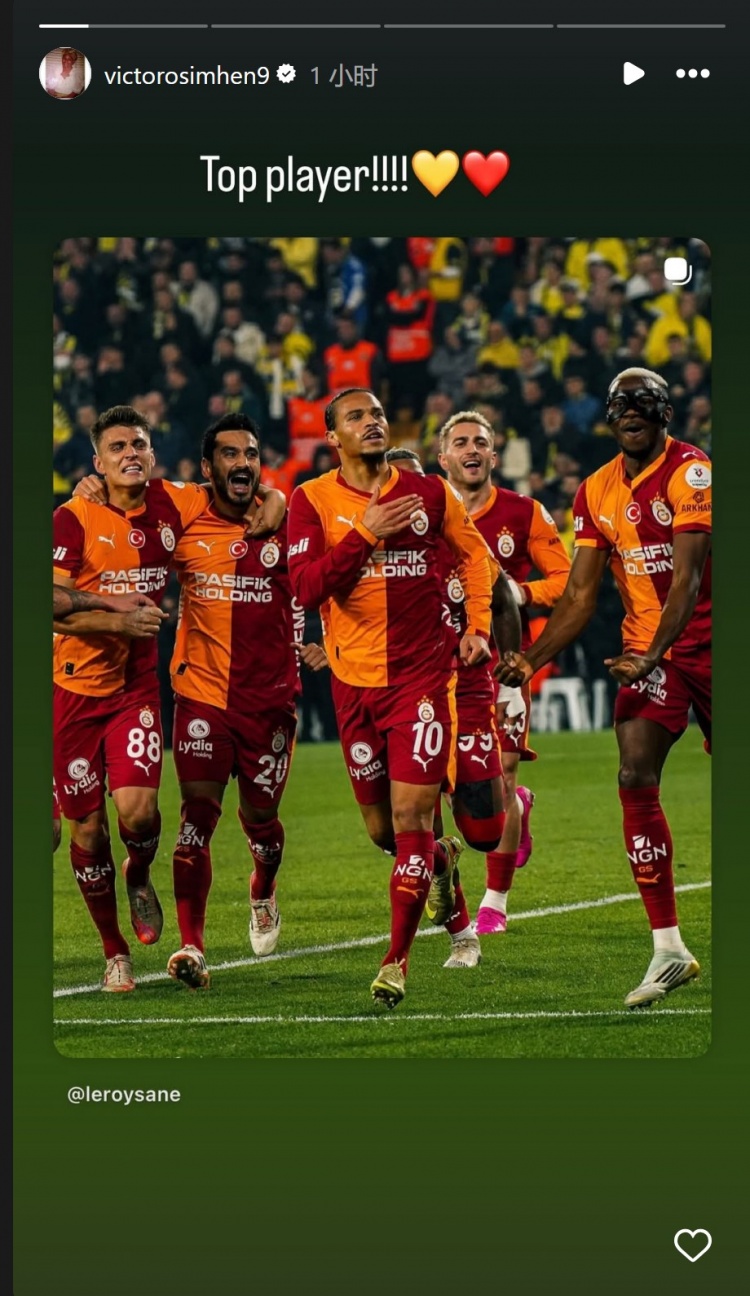 赛后奥斯梅恩社媒晒出萨内庆祝进球的像片,颂赞队友的出色默契,配文:“顶级球员!”