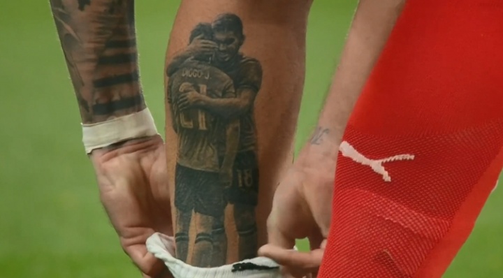 内维斯身着的恰是若塔此前的21号球衣,而且他还在小腿上文着一个若塔的文身。