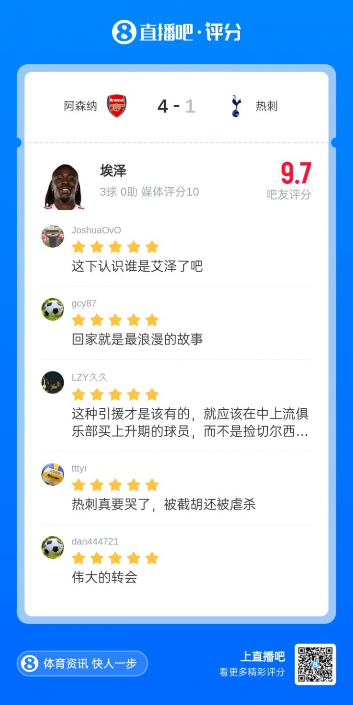 在阿森纳4-1治服热刺的比赛中,埃泽帽子戏法带队取胜,献艺了他在加盟枪手后的最好一战。埃泽获取吧友6.8万的投票,当选【X咪咕体育英超第12轮最好球员】!