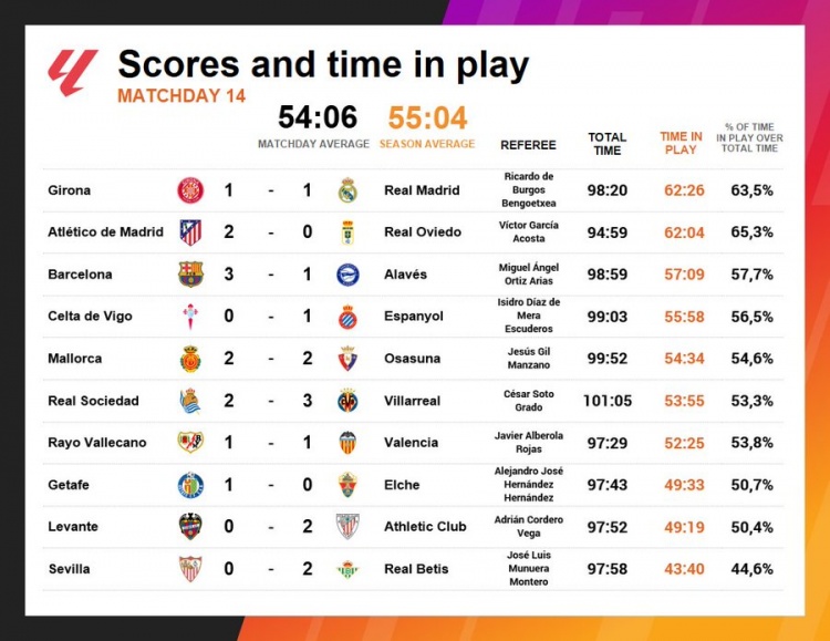 12月2日讯 数据深远,赫罗纳1-1皇马是第14轮西甲净技术最长的比赛。