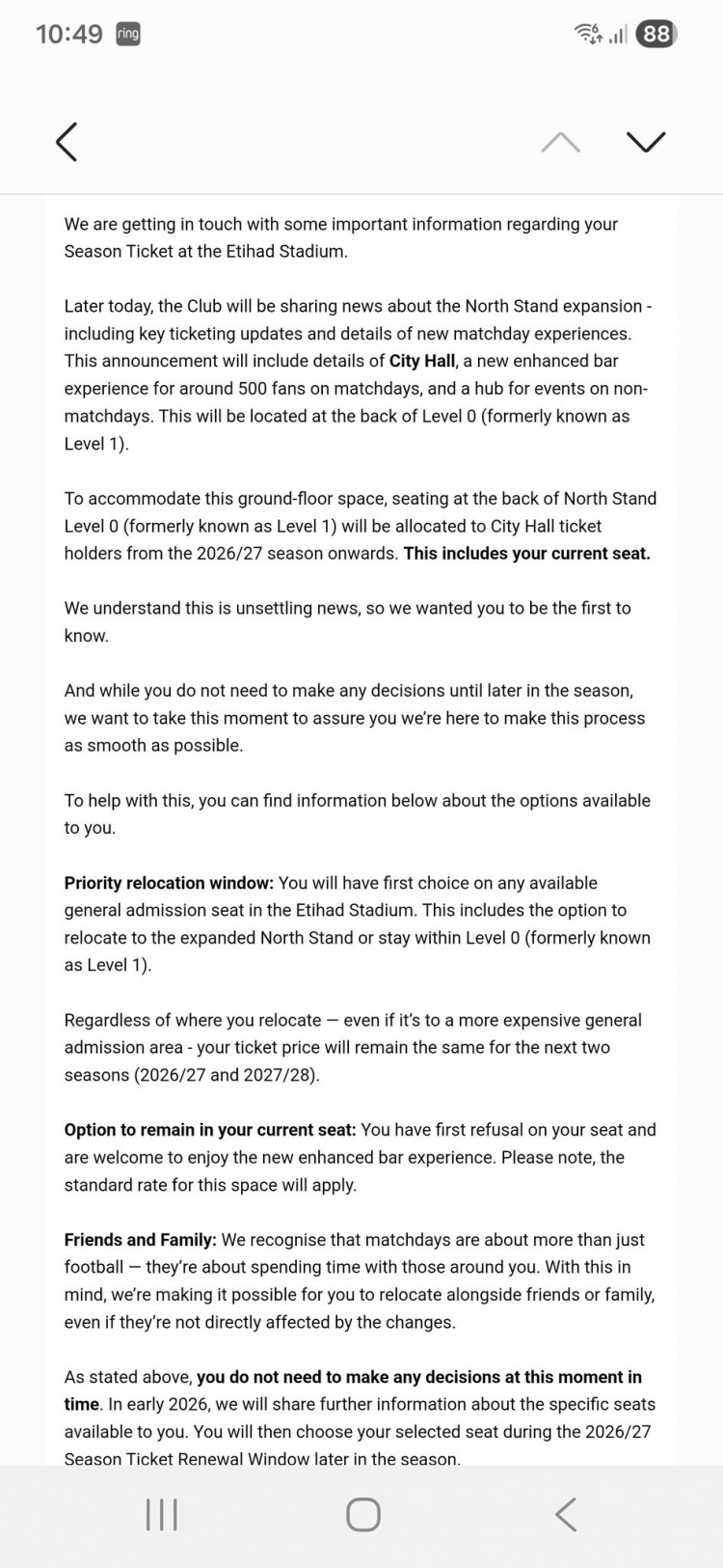 俱乐部承认这是“令东说念主不安的音讯”,并高兴提供维持。受影响的球迷将得到优先搬迁权,不错选定球场内任何可用的日常入场座位,包括搬到扩建后的新北看台或留在0层其他位置。当作抵偿,岂论搬迁到哪个区域,即使是更贵的区域,俱乐部保证其票价在2026/27和2027/28两个赛季内保抓不变。