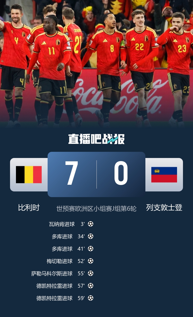 纵贯寰球杯!比利时7-0列支敦士登 多库、德凯特拉雷2射1传