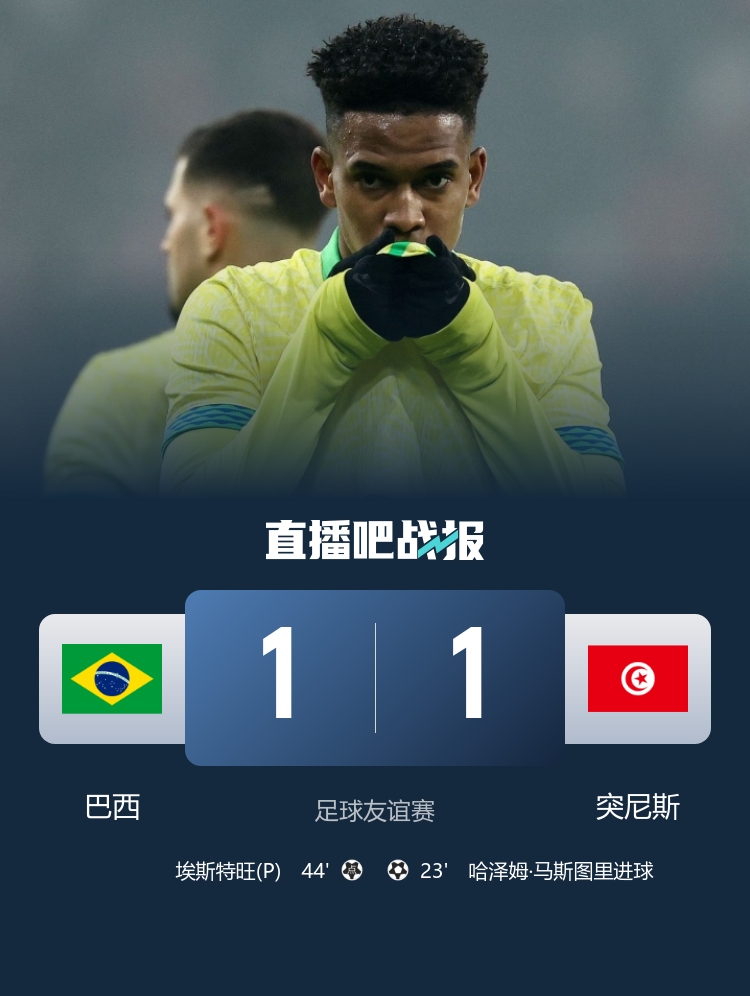 友谊赛对阵,巴西1-1战平突尼斯,埃斯特旺本场点射立功,值得柔软的是米利唐在这场友谊赛受伤了。