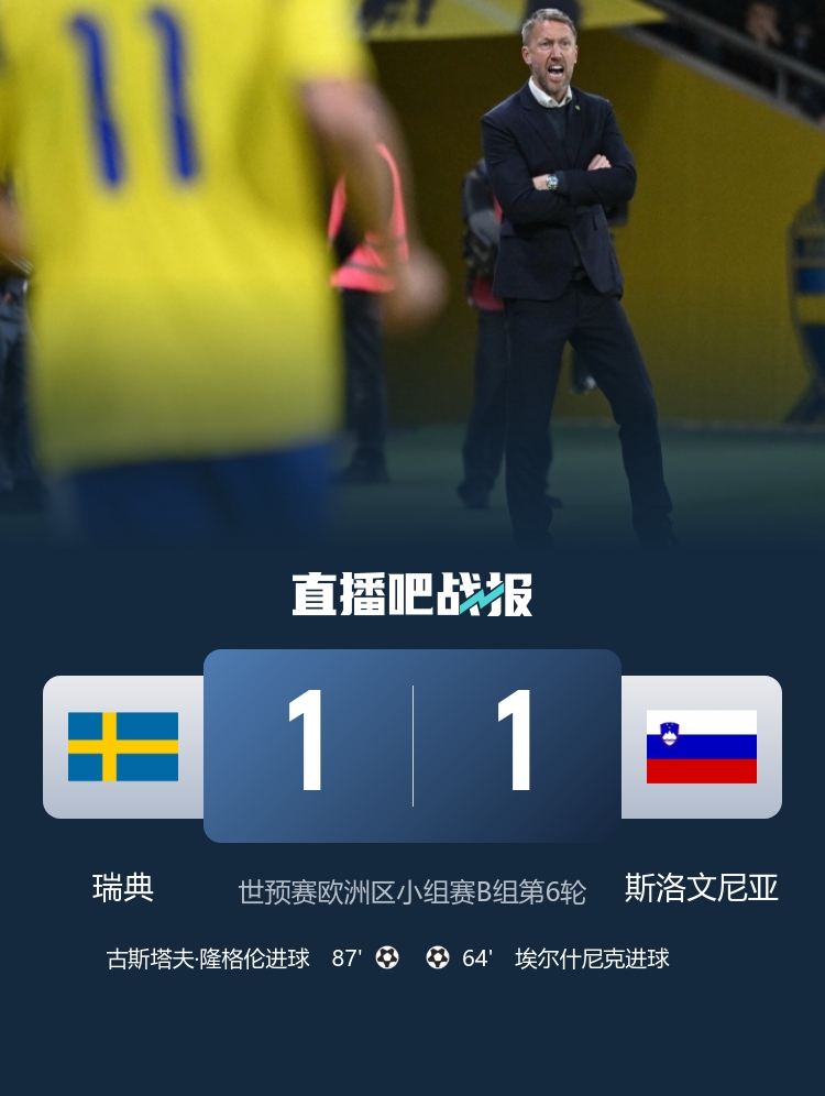 瑞典战平斯洛文尼亚,最终瑞典排行小组垫底,将凭借欧国联的保底经验插足世欧预附加赛。