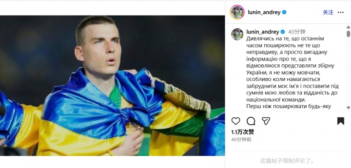 皇马门将卢宁发布社媒,关于关联我方拒却为乌克兰出场比赛的报谈进行辟谣,并称我方不行能拒却为国度出战。
