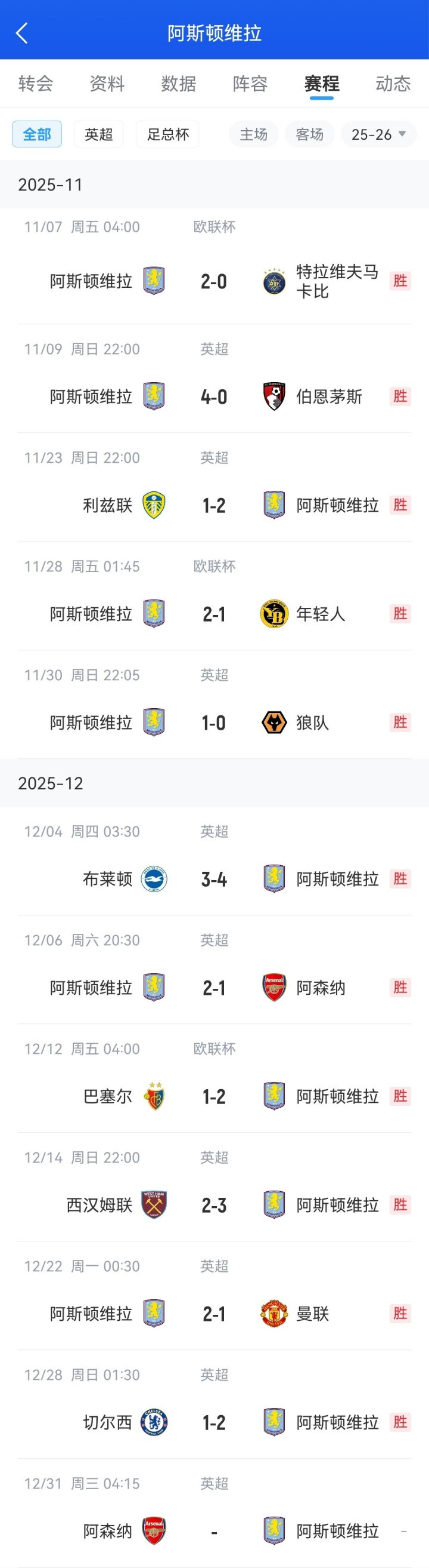 与此同期,维拉近2个月创造的各赛事11连胜也就此已矣!