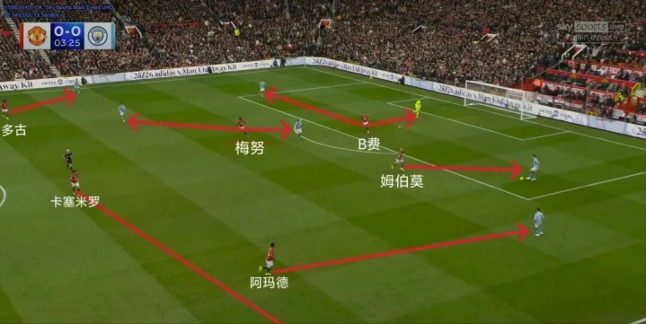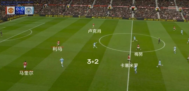 在球队后场组织阶段,卡里克安排了马奎尔-利桑德罗-卢克肖的三名出球型中卫组合,卡塞米罗与梅努会回撤协助梳理紧要,B费则较少参与这一法子,由此组成了一套3+2的后场组织架构。