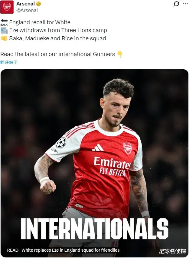 官方:怀特顶替小腿负伤 的埃泽,入选了本场国家队大名单,这也是2022年世界杯赛 以来怀特首次入选英格兰队。