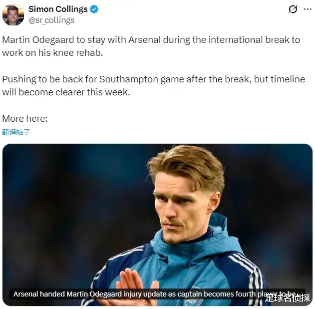 太阳报记者SC消息,厄德高在国际赛事 日期间将留在阿森纳继续复健 ,这名中场球员已经因膝伤缺席一个月之久。