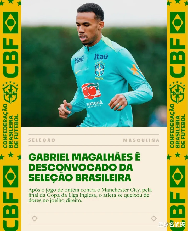 官方:巴西足协宣布加布里埃尔因膝伤(右膝疼痛)退赛了本次国家队。