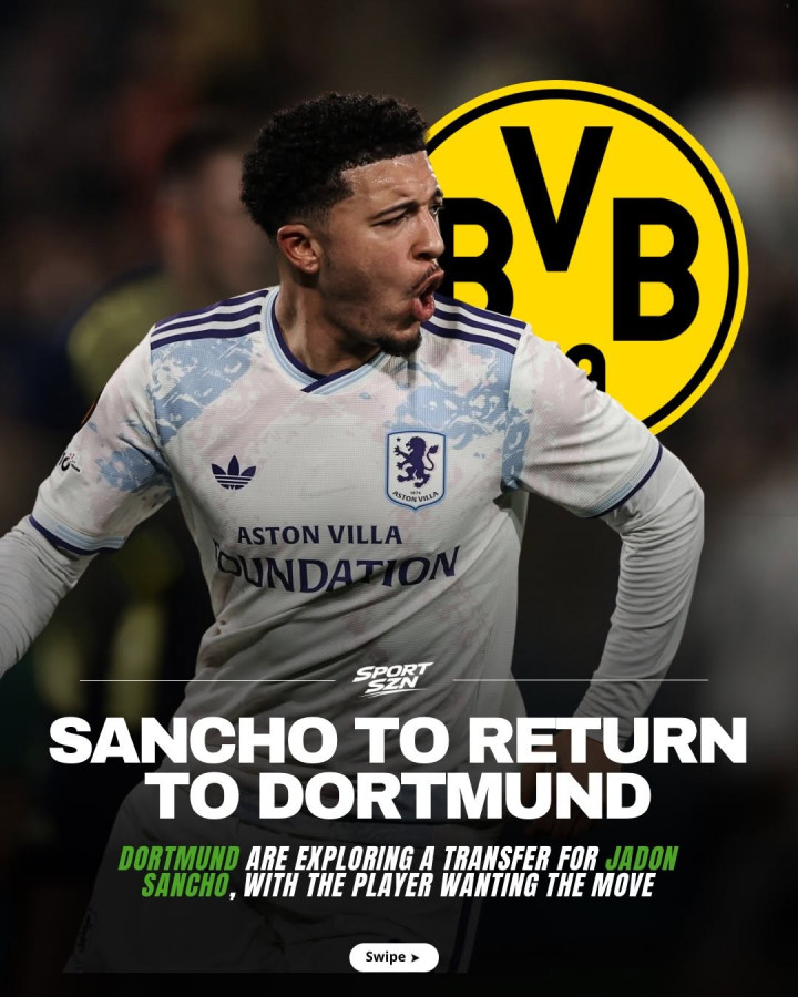 「竞赛 网」报道称,桑乔已经与多特展开谈判,希望再次加盟该队。目前维拉还没有表态,他们也有机会争夺桑乔的签约,但竞赛 网称,埃梅里还需要等待欧冠资格的揭晓,才能知晓自己可支配的资金有多少。
