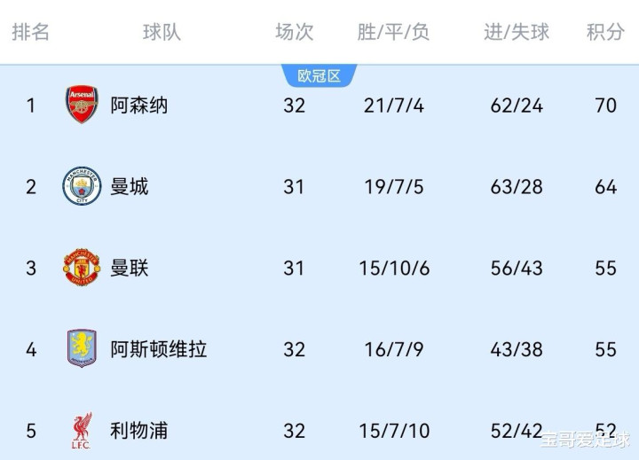 本轮过后,在英超积分榜上,阿森纳32轮积70分继续领跑,手握38个净胜球,曼城31轮积64分紧随其后,净胜球达到了35个,之后是55分的曼联和阿斯顿维拉,英超第一名 只可能在阿森纳和曼城之间产生。虽然在职业联赛 还剩6-7轮的情况下,6分的优势不算小,但是考虑到阿森纳近期竞技状态 低迷,又总是有在赛季末冲刺跑 阶段掉链子的毛病,而且曼城又比阿森纳少赛了一场,两队之间还有一场直接交锋,双方的净胜球也是相差无几,阿森纳的领跑 优势早已岌岌可危,英超第一名 的归属又重新充满了悬念。