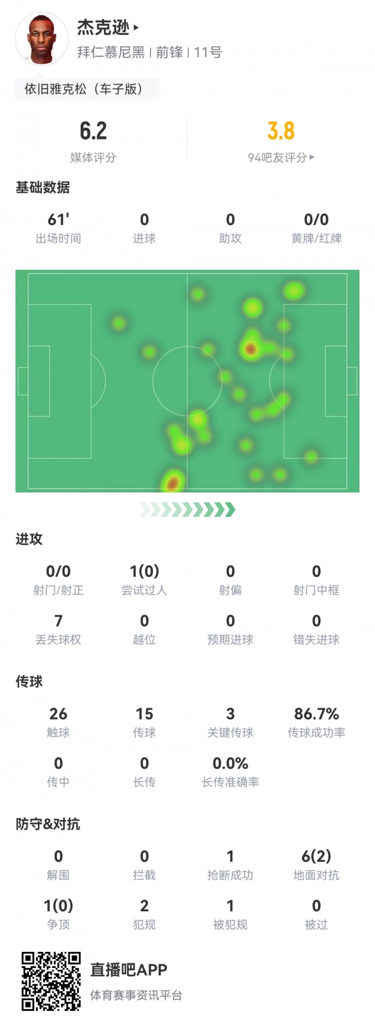 10月19日讯 本轮德甲焦点战,拜仁主场2-1多特。此役杰克逊首发61分钟被换下,球员全场要点数据如下↓
