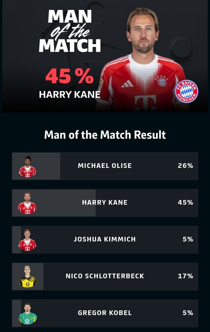 10月19日讯 德甲第7轮焦点战,拜仁2-1多特蒙德。凯恩首发出战,孝敬1粒进球,赛后当选全场最好。
