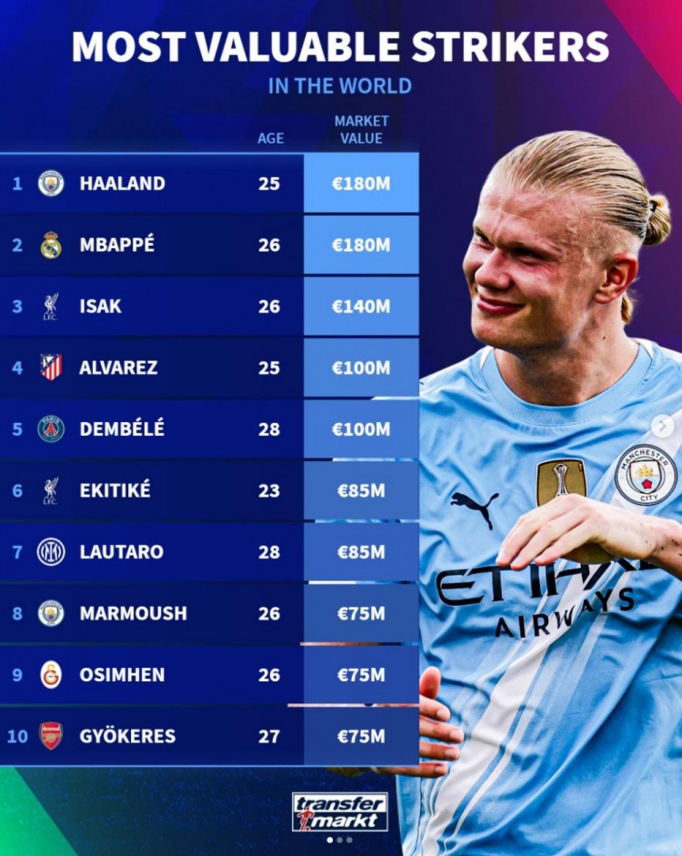 11月3日讯 德转列现时寰宇足坛中锋身价排名,哈兰德、姆巴佩1.8亿欧并排最高,伊萨克1.4亿欧,阿尔瓦雷斯、登贝莱1亿欧。
