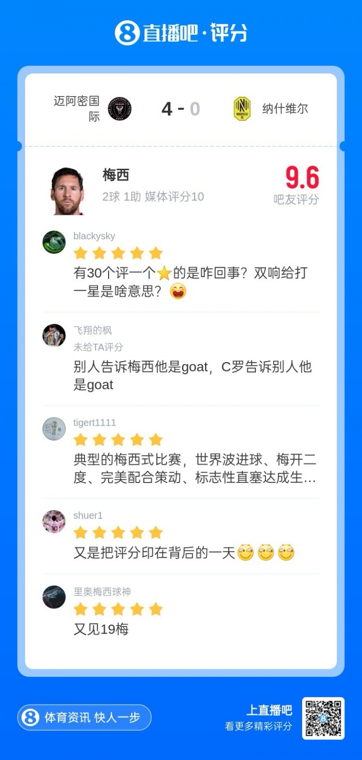 逾越3600名吧友给梅西评分,现在评分为9.6,94.5%五星,4.9%一星。