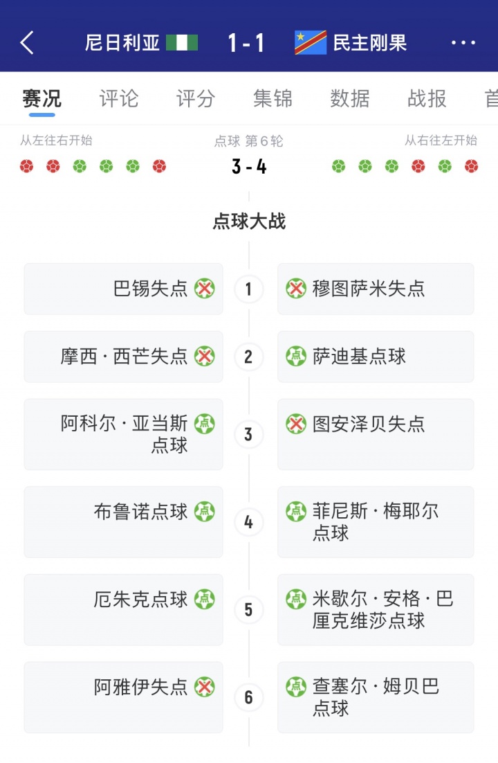 两队120分钟战成1-1,干预点球大战。尼日利亚1次点球射失,2次点球被扑,最特地球大战3-4不敌民主刚果。两队的门将进展英勇,分手完成两次扑点。